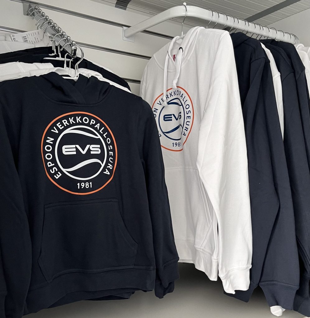 Myynnissä uudella logolla varustettuja lippiksiä, huppareita ja T-paitoja EVS:n valkoisena ja sinisenä sekä lapsille että aikuisille.